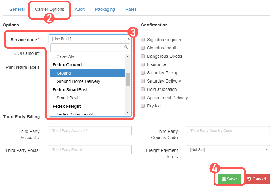 - Choose a service code that supports COD for the carrier which is being used to ship the order under the Service Code dropdown