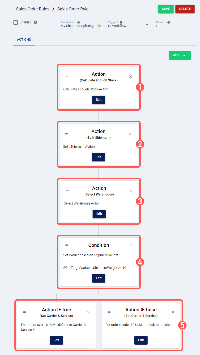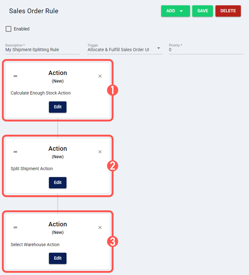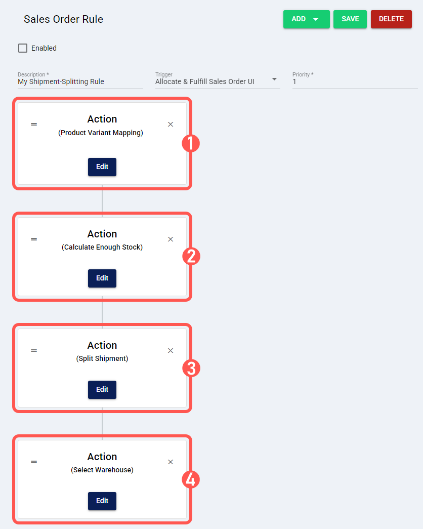 For example, to apply a product variant mapping and then split the shipment using a prioritized list of warehouses (as shown in use case ii), your rule should have the following actions in this order: