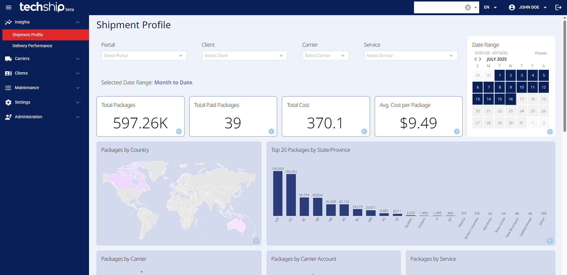 The new Insights section in techSHIP 2025 introduces a suite of interactive dashboards designed to help you monitor performance, control costs, and make informed operational decisions. These dashboards offer powerful visualizations and on-the-fly filtering to analyze shipping activity across clients, carriers, and services.